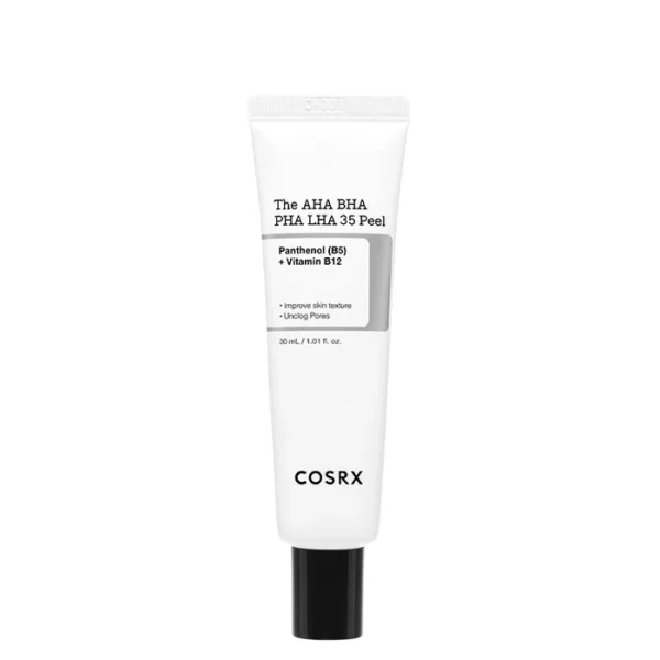 COSRX The AHA BHA PHA LHA 35 Peel is a highly concentrated, exfoliating facial peel made with 35% multi-acids, including AHA, BHA, PHA and LHA. The combination of this exfoliating acids evens out skin texture, refines and tightens enlarged pores, sloughs away dead and dull skin cells to reveal visibly smoother and illuminated complexion. Vitamin B12 is added which gives this peel a natural pink colour, while preventing irritation after exfoliation.