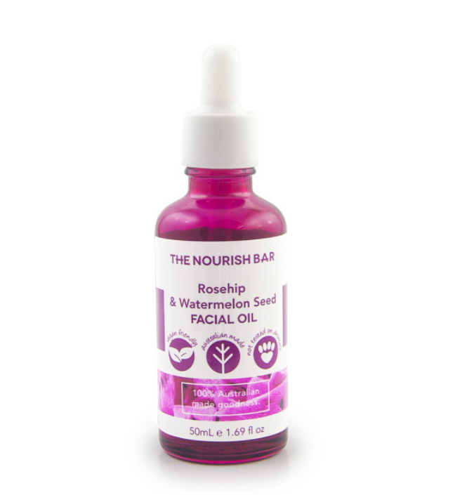Vitis Vinifera (Grapeseed) Seed Oil, Caryodendron Orinocense (Cacay) Seed Oil, Olea Europaea (Olive) Fruit Oil, Prunus Amygdalus Dulcis (Sweet Almond) Oil, Helianthus Annus (Sunflower) Seed Oil, Glycine Soja (Soya Bean) Oil, Cocos Nucifera (Coconut) Oil, Persea Gratissima (Avocado) Oil, Punica Granatum (Pomegranate) Seed Oil, Rosa Canina (Rosehip) Fruit Oil, Argania Spinosa (Argan) Kernel Oil, Camellia Oleifera (Camellia) Seed Oil, Tocopheryl Acetate (Vitamin E), Simmondsia Chinensis (Jojoba) Seed Oil, Citrus Aurantium Dulcis (Orange) Peel Oil, Pelargonium Graveolens (Geranium) Flower Oil, Pogostemon Cablin (Patchouli) Oil, Squalane, Citronellol, Geraniol, Linalool, Limonene, Citral. Rosehip & Watermelon Seed Facial Oil