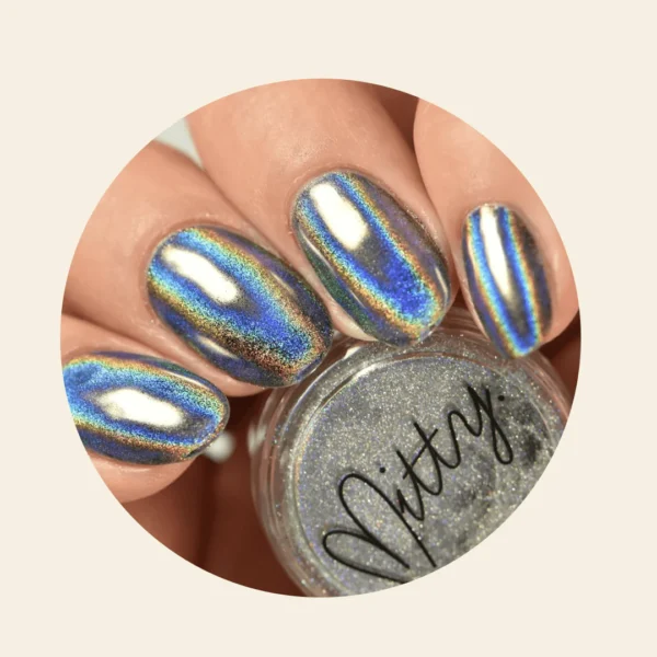 Mitty nail holographic powder is made with FDA, EU, & AU compliant ingredients. Cosmetic grade pigments.