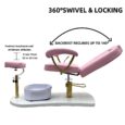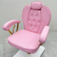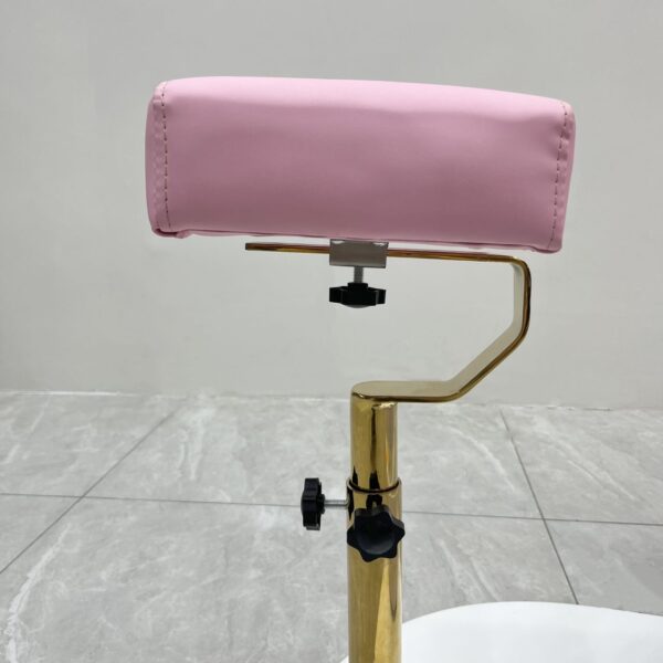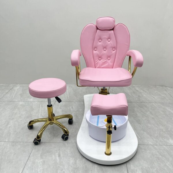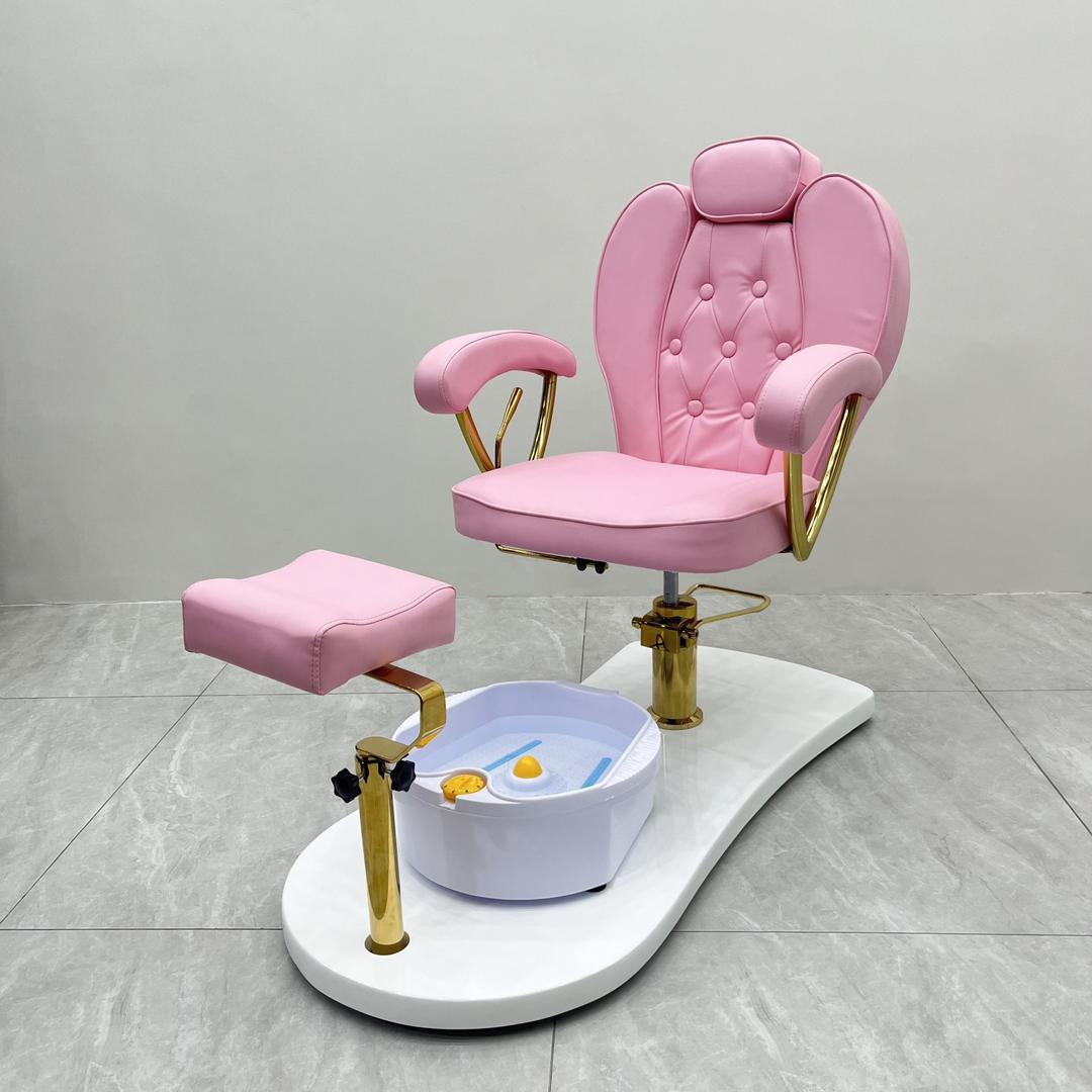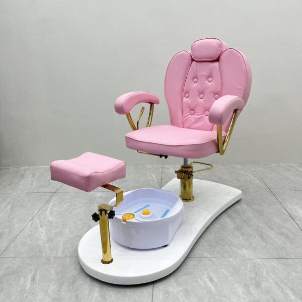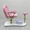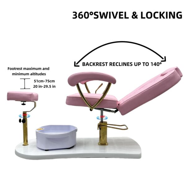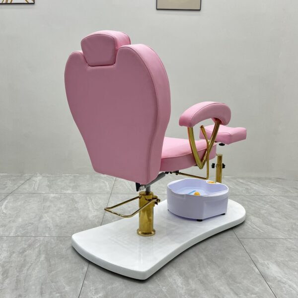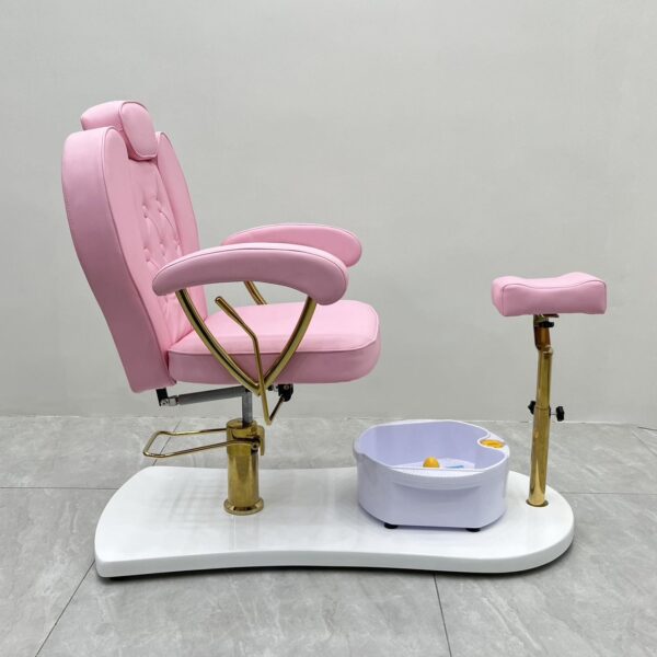 Featuring a portable foot spa basin that requires no plumbing, it provides flexibility and ease of use without costly installation. The adjustable padded footrest ensures proper positioning for both client comfort and technician convenience. Built with a sturdy base and gold-finished arm supports, the chair is as durable as it is stylish.