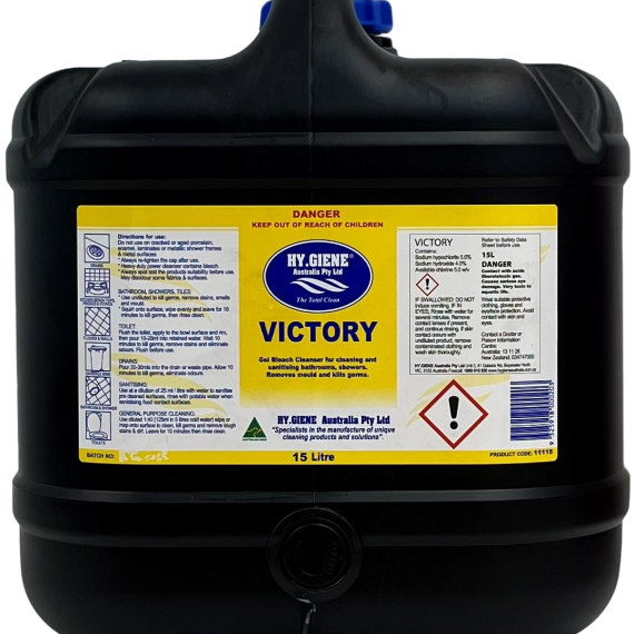 VICTORY is a specially formulated gel bleach cleanser sanitiser which will effectively clean and sanitize all bathroom, tiled and hard surface areas.
