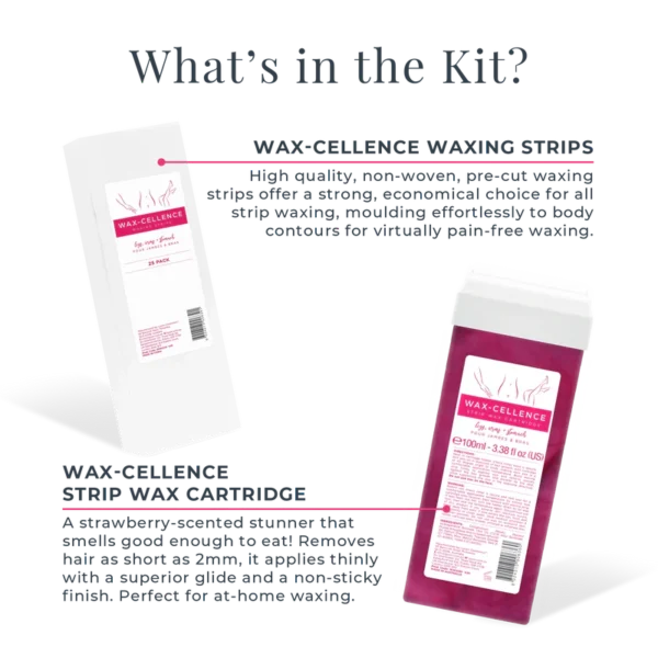 The perfect cartridge home waxing kit, with Wax-cellence famous cartridge strip wax formula for superior glide, leaving no sticky residue. Wax-cellence strip wax is safe and easy for beginners to use in the comfort of your own home!