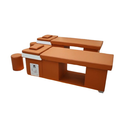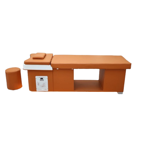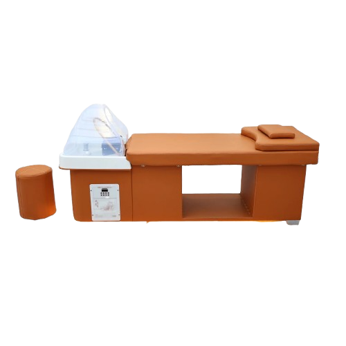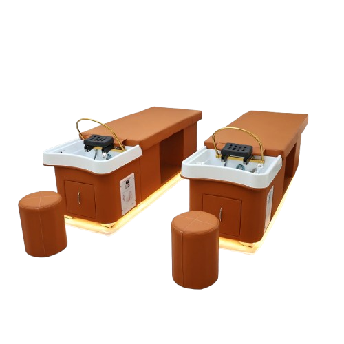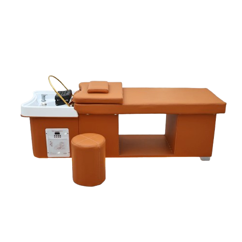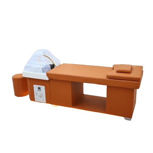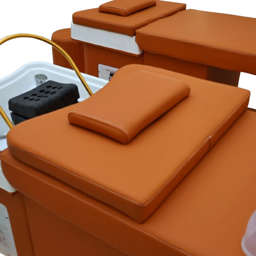 The Wooden Bliss Japanese Head Spa is a beautifully crafted professional treatment bed featuring a solid oak frame for exceptional durability and stability. Designed for premium scalp and relaxation treatments, this plumbed head spa unit provides a comfortable client experience while allowing practitioners to perform Japanese head spa services with ease. Its modern orange upholstery and integrated basin create a functional and stylish addition to any salon or wellness space.
